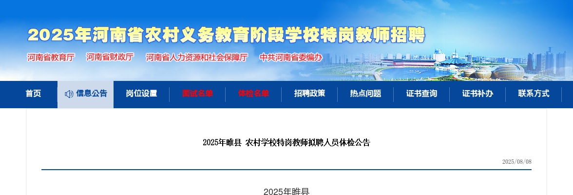 原标题:2025年睢县 农村学校特岗教师拟聘人员体检公告