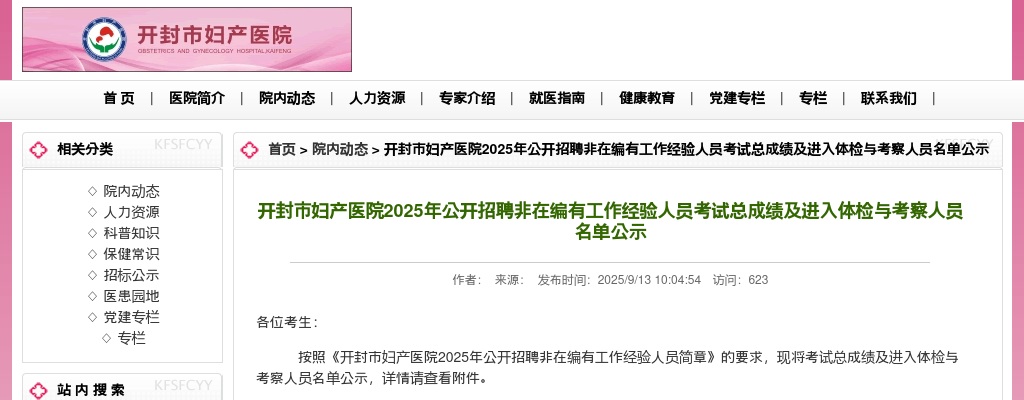 原标题:开封市妇产医院2025年公开招聘非在编有工作经验人员考试总成绩及进入体检与考察人员名单公示